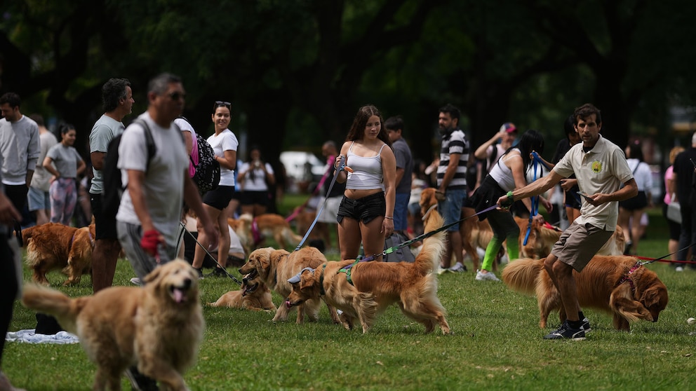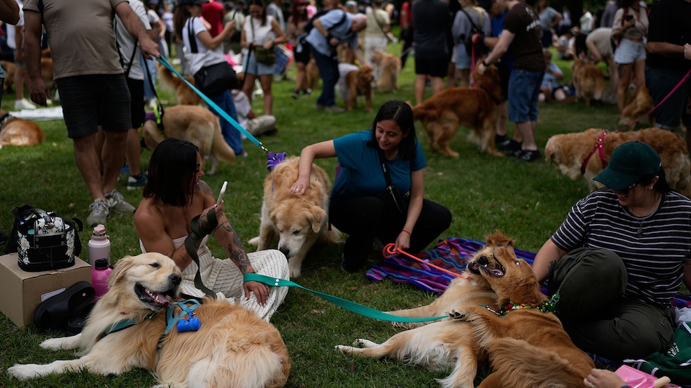 La sinfonía de ladridos y el mar de pelajes dorados transformaron el paisaje habitual del parque porteño (AP Photo/Natacha Pisarenko)